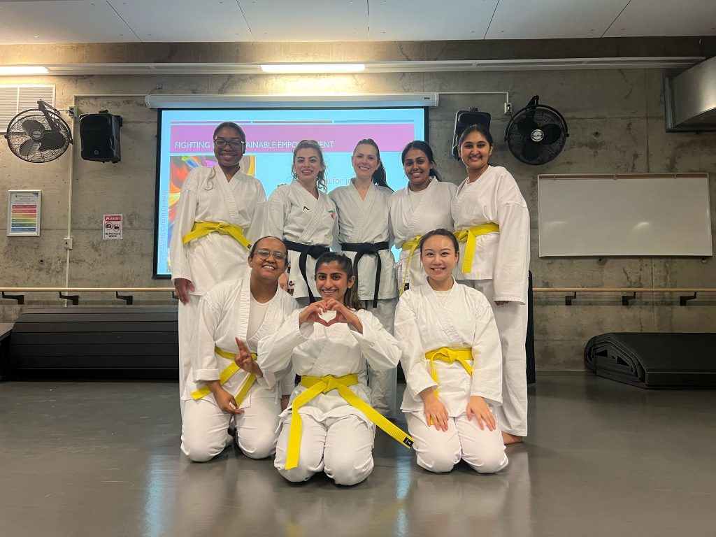 The Fighting for Sustainable Empowerment (FSE) Project, funded as a UM-SSHRC, aimed to develop and implement a pilot pedagogical model for the empowerment of newcomer students identifying as women through a University-based feminist karate program, which combines sports karate training and feminist theoretical classes. As a part of the project, women at the University of Manitoba gather to learn karate every Saturday night with Dr. Fabiana Turelli.