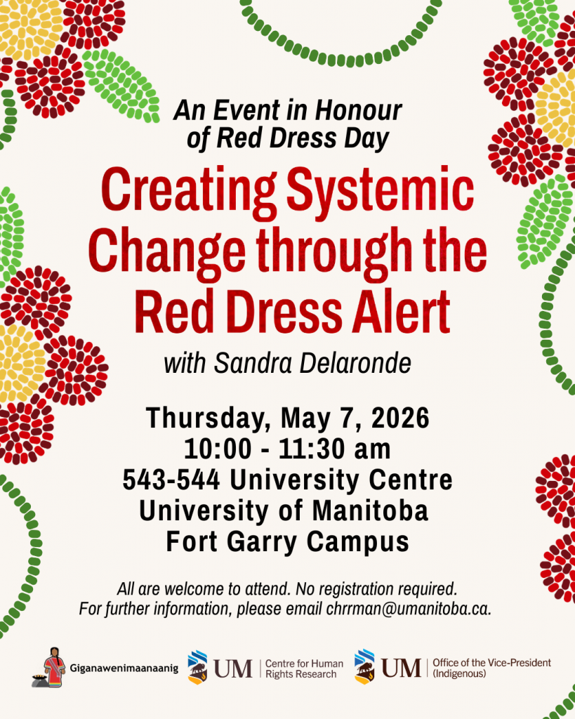 On Thursday, May 7th, 2026, Giganawenimaanaanig and the Centre for Human Rights Research at the University of Manitoba invite you to join an event in honour of National Day of Awareness for Missing and Murdered Indigenous Women and Girls and 2SLGBTQIA+ (MMIWG2S+) people, also known as Red Dress Day. This year, we are honoured to host Sandra Delaronde to speak on “Creating Systemic Change through the Red Dress Alert”.