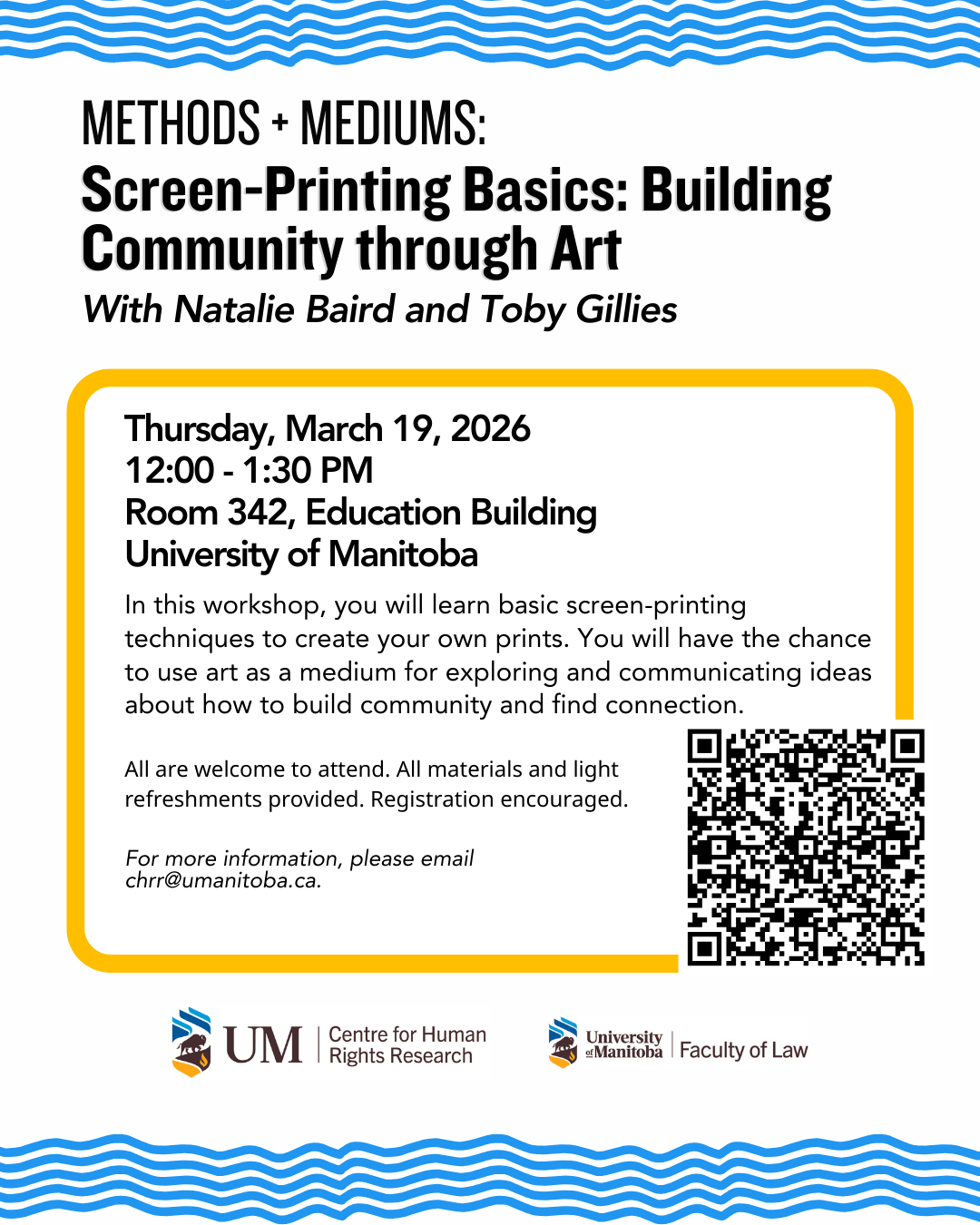 Join us for a workshop with Natalie Baird and Toby Gillies on basic screen-printing techniques. The workshop will be held on Thursday, March 19, 2026, from 12:00 pm – 1:30 pm in Room 342, Education Building, Fort Garry Campus – University of Manitoba.