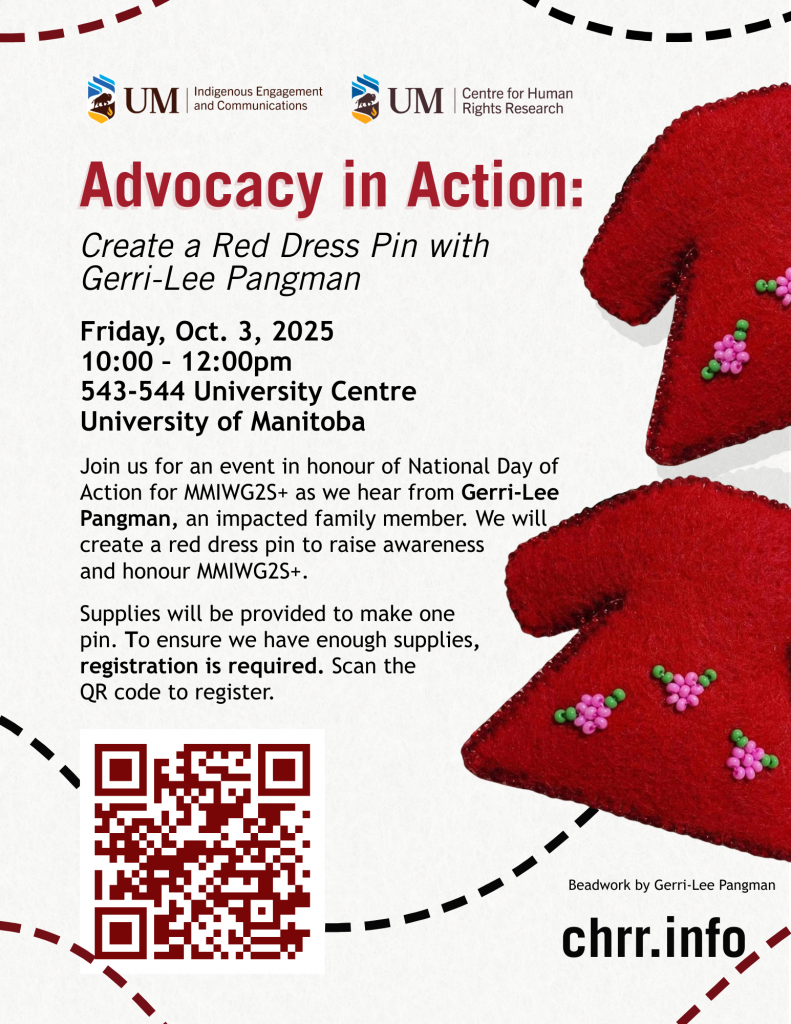 If you can no longer attend, please email chrr@umanitoba.ca. In lieu of a registration fee, please consider making a donation to Indigenous organizations working with MMIWG2S+.