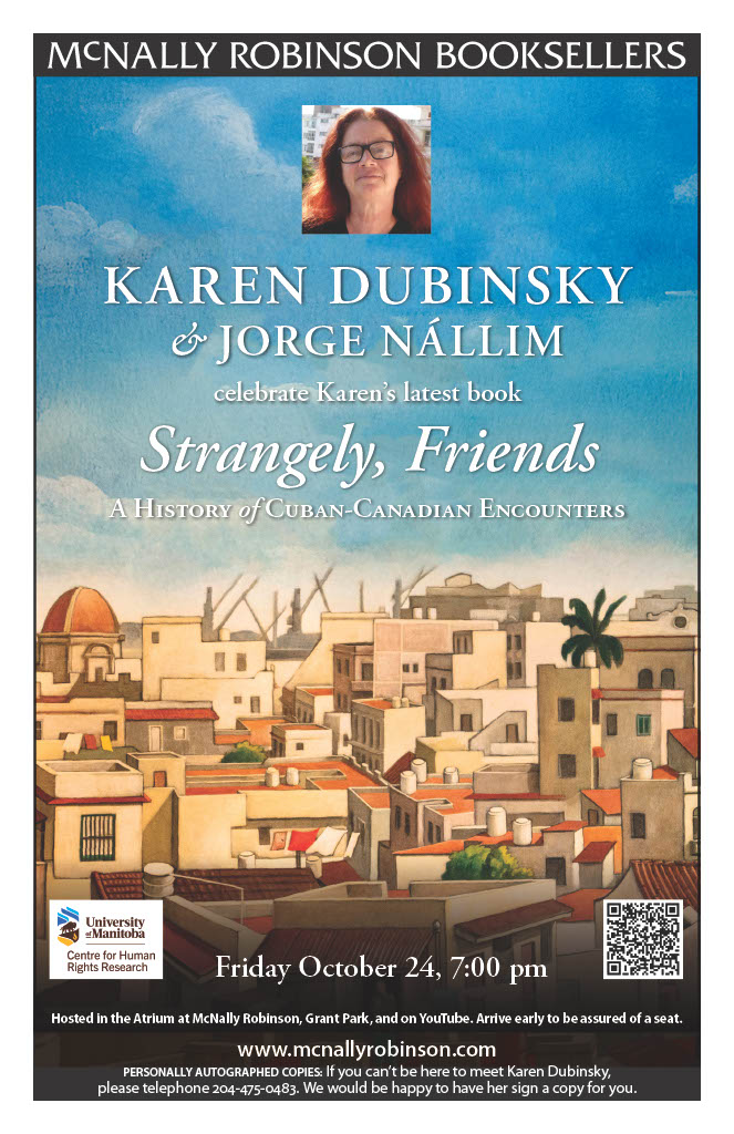 Join historians Karen Dubinsky and Jorge Nállim for an evening on Cuban-Canadian encounters through music, art, politics and more. This event will include a reading from Dubinsky’s latest book, Strangely, Friends: A History of Cuban-Canadian Encounters (Between the Lines Books) and a Q&A with the audience, followed by a book signing. Co-presented by the Centre for Human Rights Research at the University of Manitoba.