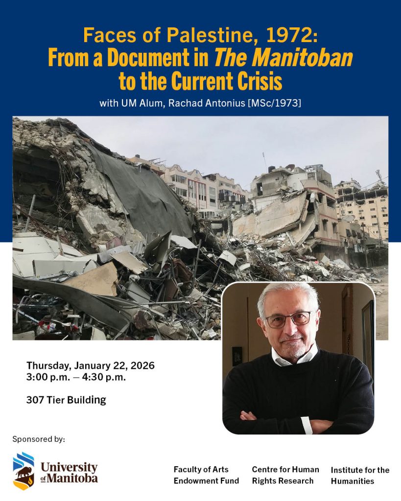 In collaboration with the Faculty of Arts and the Institute for the Humanities, the Centre for Human Rights Research (CHRR) is pleased to support UM Alum Rachad Antonius for a lecture titled Faces of Palestine, 1972: From a Document in The Manitoban to the Current Crisis.