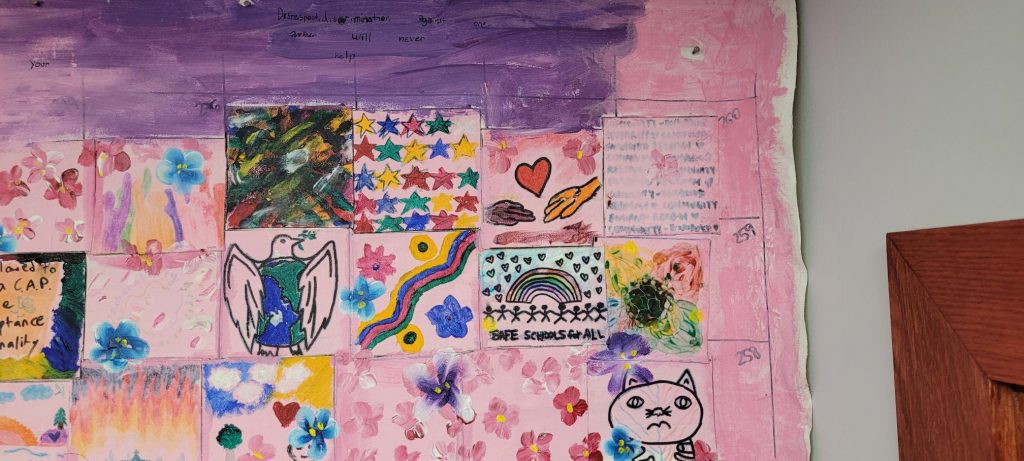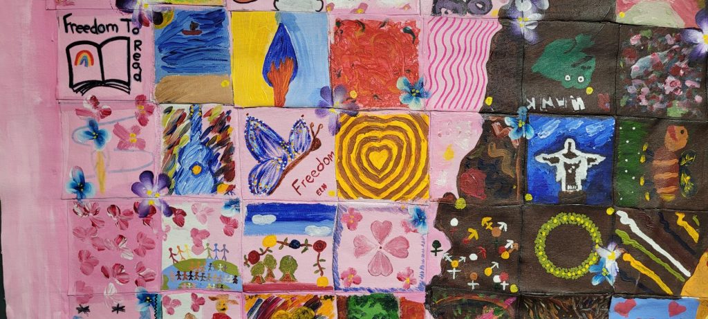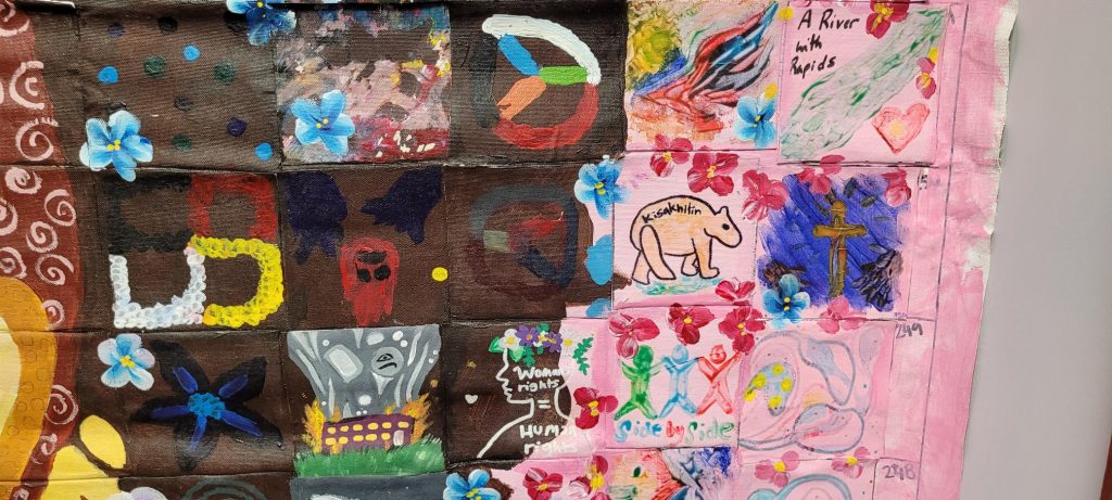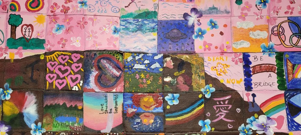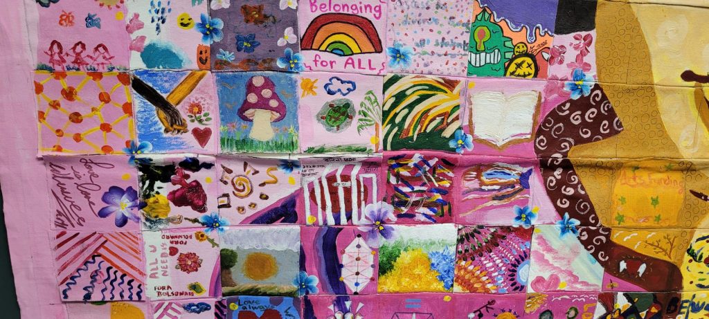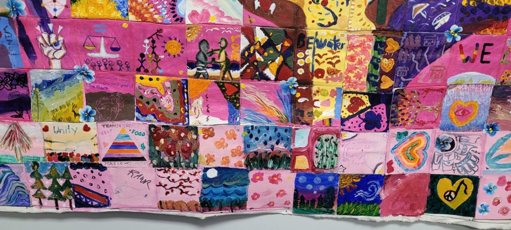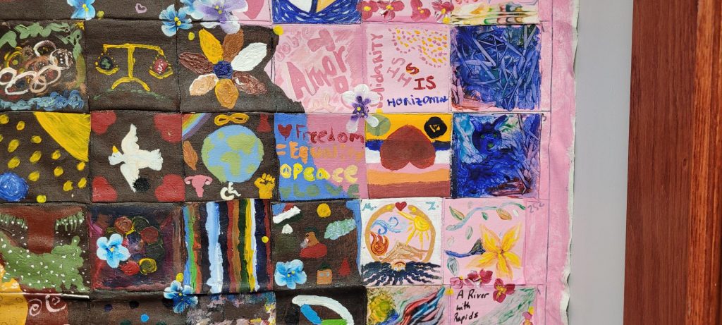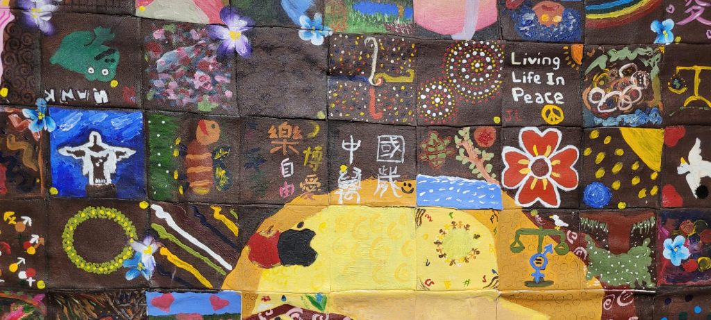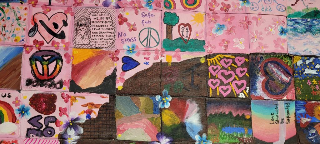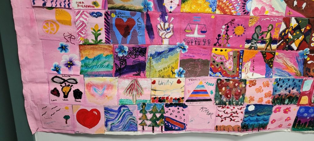 This mural was created by Dr. Bruno de Olivera Jayme as a collective art piece from his travels around the world. The mural reflects Dr. de Oliveira Jayme’s teaching pedagogy, which uses art as a way of learning about issues in social justice alongside one another. Each piece of the artwork was made by event participants who were given a 10×10-inch piece of canvas to paint or write on as guided by a prompt.