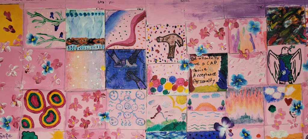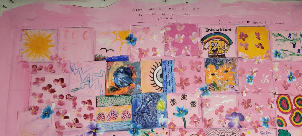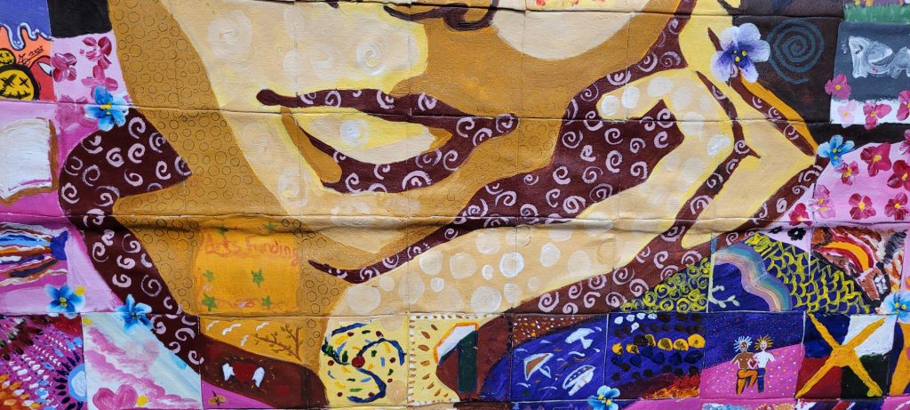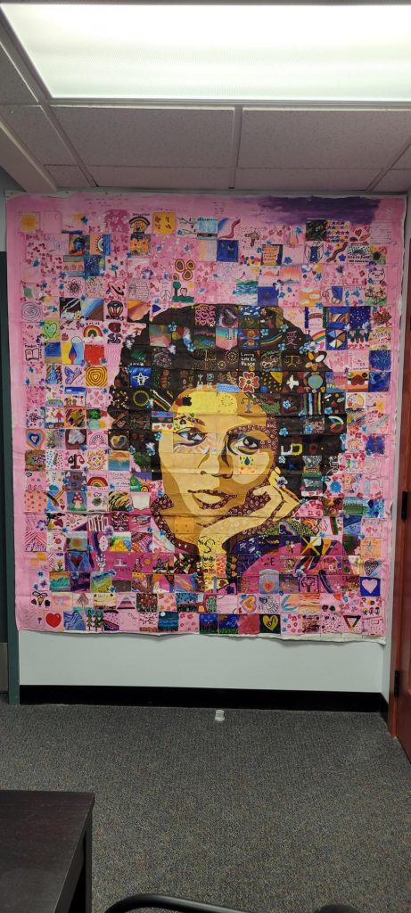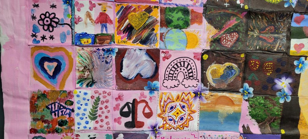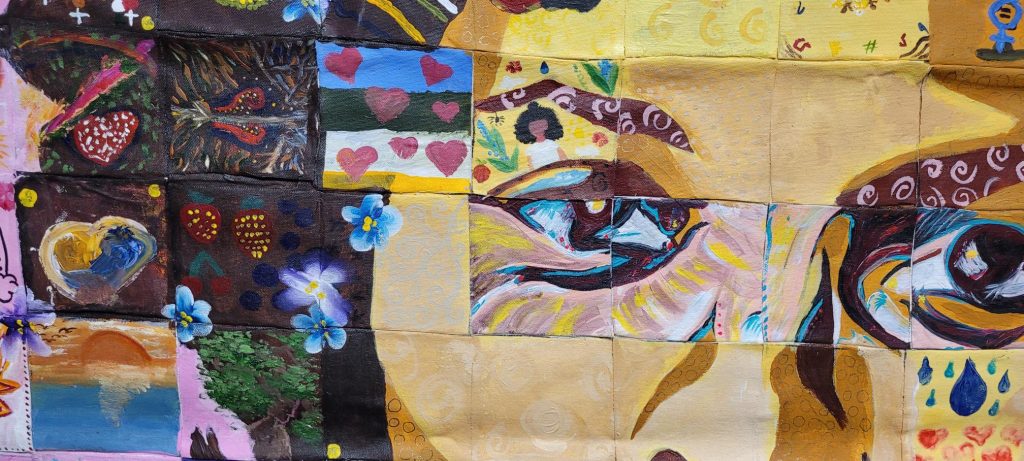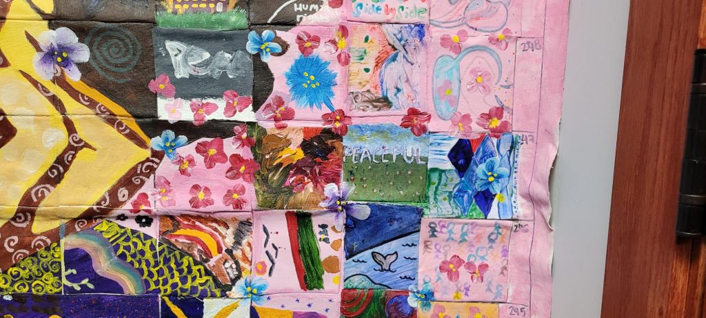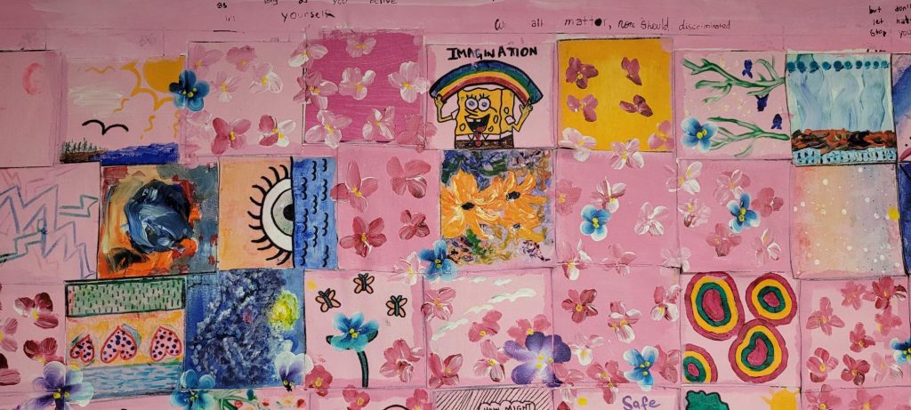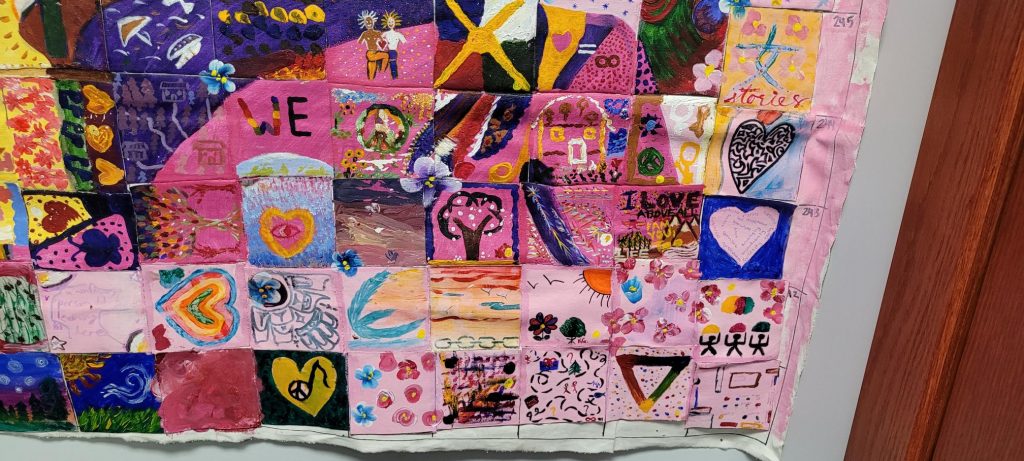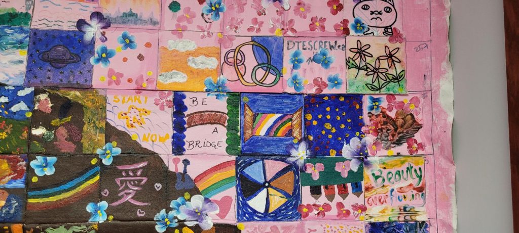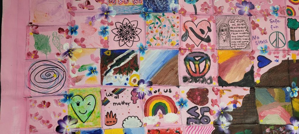 …people come to the events… and they receive a 10 by 10 little square, not very intimidating. Because when you ask adults to paint something, to make art, it’s scary… But when you ask them to paint something in a little scary, it’s not that intimidating because it’s not very big. And I give them a prompt. And so they did, and once they did, we assembled the pieces together. And a larger collective image formed. But it was so not scary because it was just a small piece that they were able to tell their stories through that little square. It’s so important for the collective because if one square is missing… the whole story is going to be compromised. So that’s what I’m saying. Art helps us have these difficult conversations in a light manner. The idea of community is very important… Community is an art of its own.”